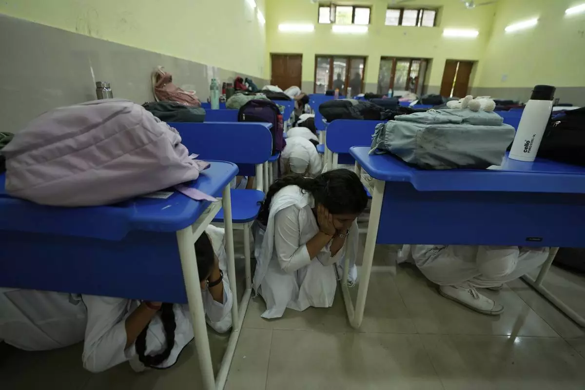 School students take shelter during mock drills amid India Pakistan tension, in Jammu, India, Tuesday, May 6, 2025. (AP Photo/Channi Anand)