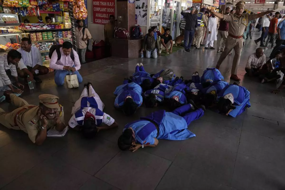 Civil defense and railway police carry out a mock drill at Kachiguda railway station to train civilians and security personnel to respond in case of attack in Hyderabad, India, Wednesday, May 7, 2025. (AP Photo/Mahesh Kumar A.)