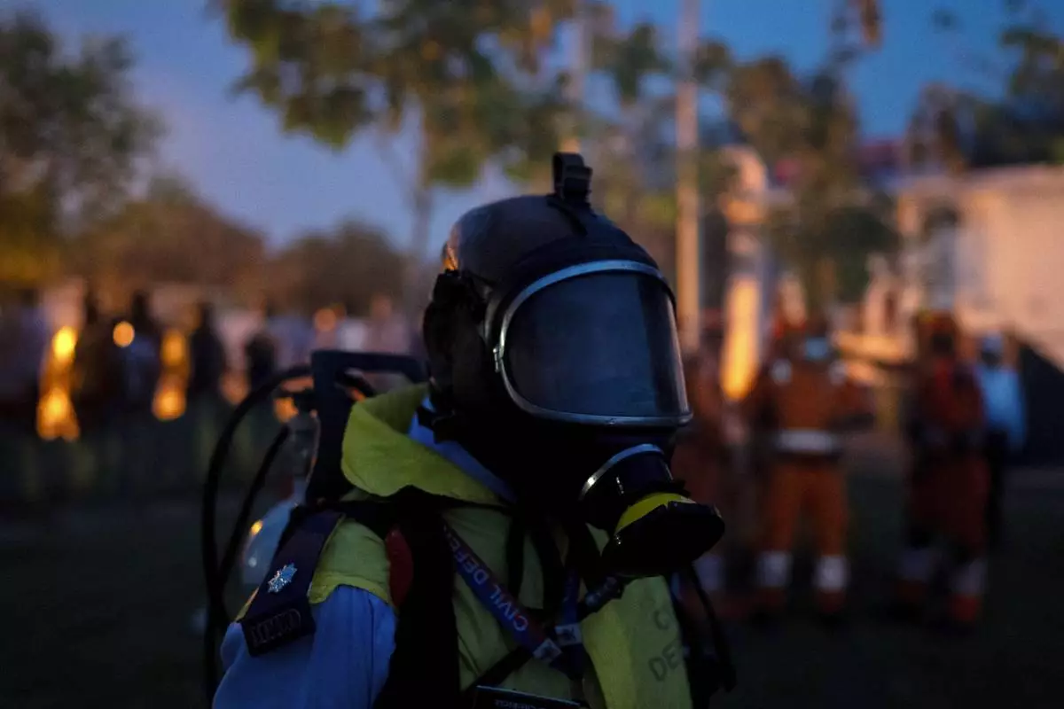 A firefighter participates in a drill to help train civilians and security personnel to respond in case of attack in Prayagraj, India, Wednesday, May 7, 2025 amid rising fears of wider conflict following India's strikes in Pakistan. (AP Photo/Rajesh Kumar Singh)