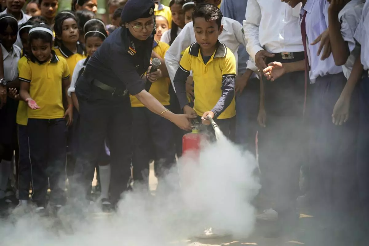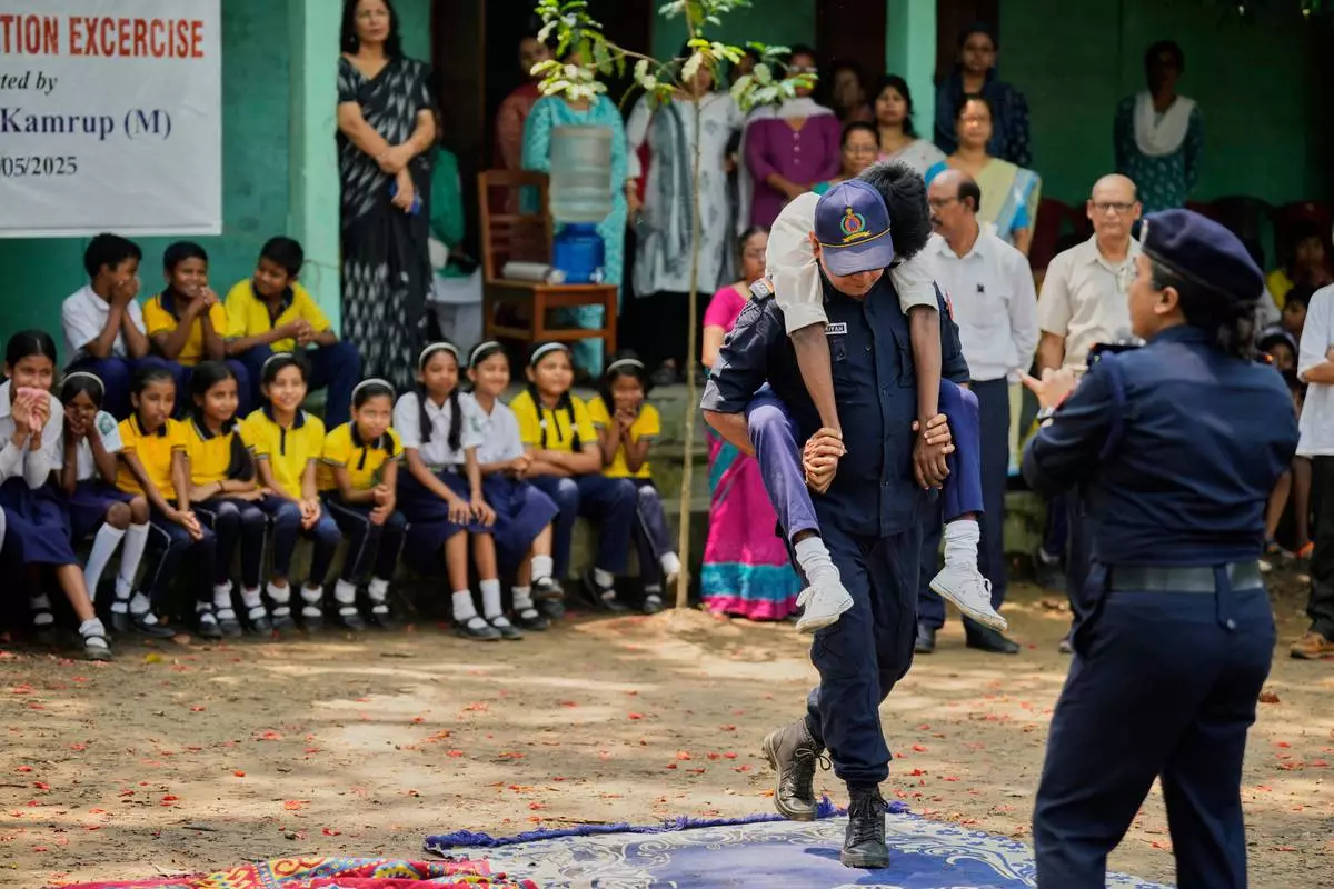 Civil defense members participate in a mock drill to train school students to respond in case of attack in Guwahati, India, Saturday, May 10, 2025 amid rising fears of wider conflict following India's strikes in Pakistan. (AP Photo/Anupam Nath)