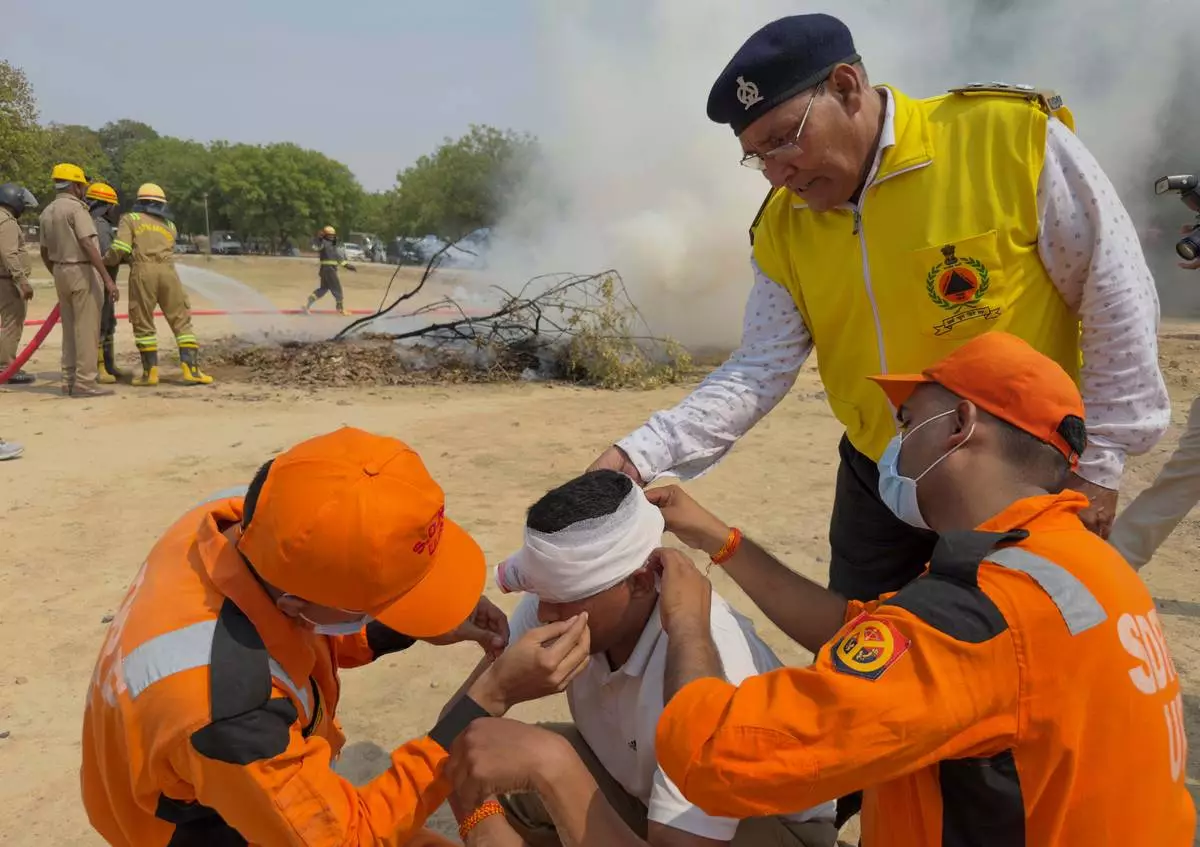 Uttar Pradesh State Disaster Response Force and Civil Defence personnel participate in a mock security drill on the outskirts of Prayagraj, India, Wednesday, May 7, 2025 amid rising fears of wider conflict following India’s strikes in Pakistan. (AP Photo/Rajesh Kumar Singh)