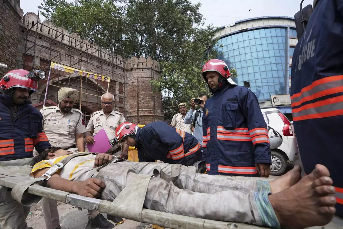 Firefighters carry out a mock drill to train civilians and security personnel to respond in case of an attack, in the old quarters of New Delhi, India, Saturday, May 10, 2025. (AP Photo/Karma Bhutia)