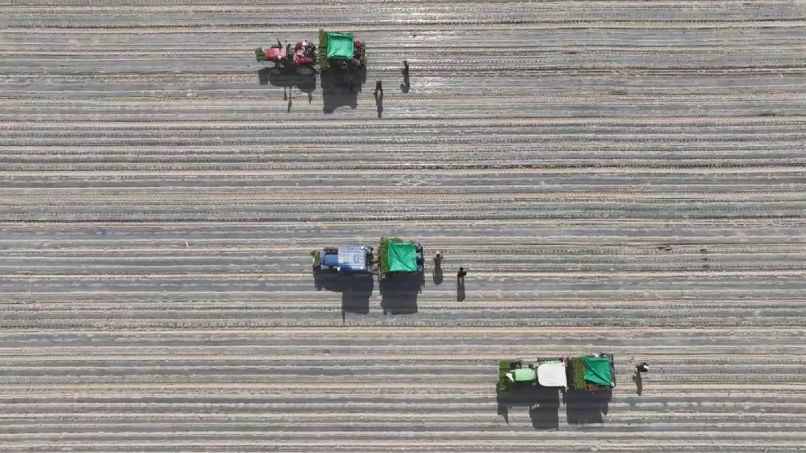 At a chili farm in Jinta County, driverless tractors towing automated transplanting machines move steadily through the fields. In a single pass, these machines punch holes, place seedlings, and complete the transplanting process.