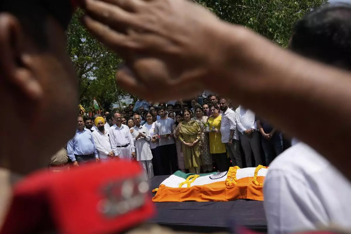 Police personnel pay tribute to Raj Thapa, a senior bureaucrat who was killed in Pakistani shelling in Rajouri, at his funeral in Jammu, India, Sunday, May 11, 2025. (AP Photo/Channi Anand)
