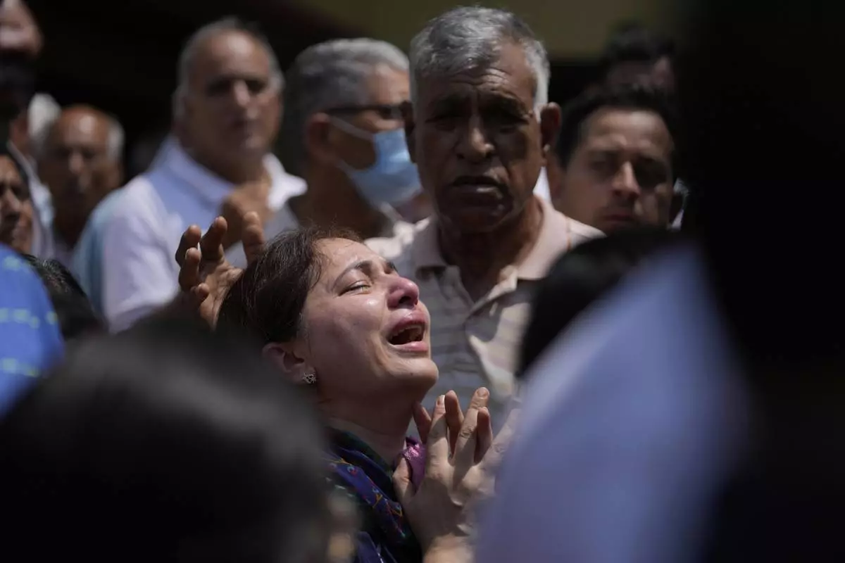 A relative mourns at the funeral of Raj Thapa, a senior bureaucrat who was killed in Pakistani shelling in Rajouri, in Jammu, India, Sunday, May 11, 2025. (AP Photo/Channi Anand)