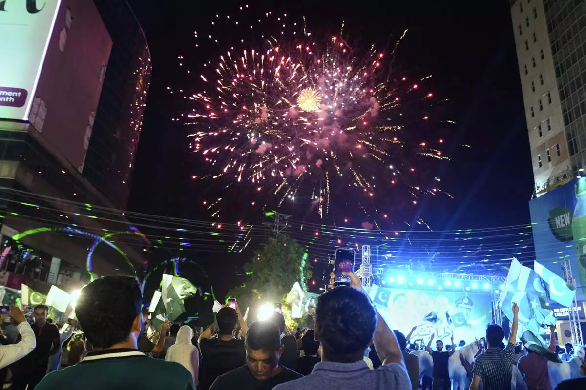 People watch fireworks during an event to show solidarity with the Pakistan Army, a day after the ceasefire between Indian and Pakistan was announced, in Lahore, Pakistan, Sunday, May 11, 2025. (AP Photo/K.M. Chaudary)
