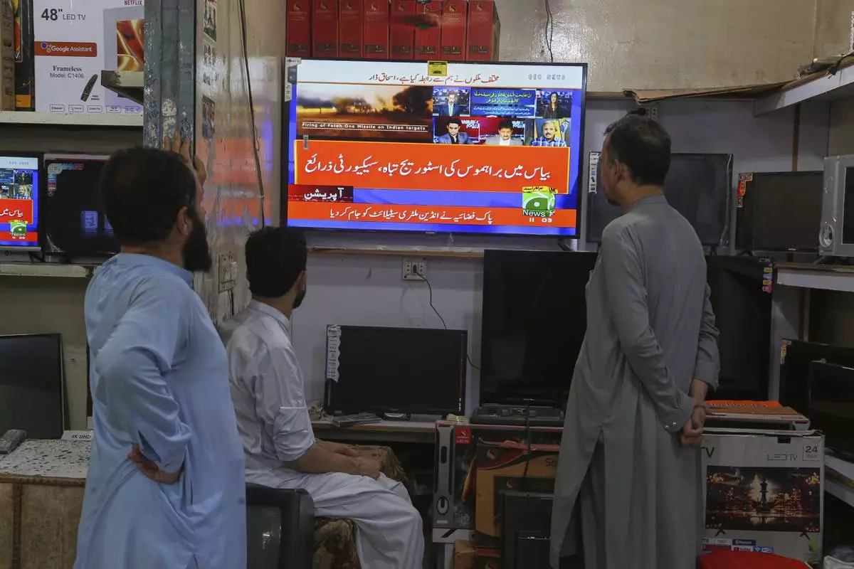 Shopkeepers watch a news channel telecasting ongoing military tension between Pakistan and India, at a shop in Peshawar, Pakistan, Saturday, May 10, 2025. (AP Photo/Muhammad Sajjad)