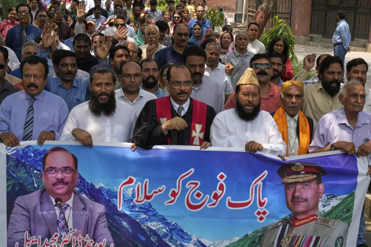 People from Christian and Muslim communities hold a demonstration to show their support with Pakistan Army, a day after the ceasefire between Indian and Pakistan, in Lahore, Pakistan, Sunday, May 11, 2025. (AP Photo/K.M. Chaduary)