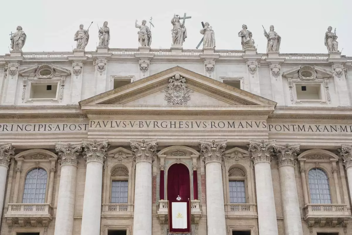 Pope Leo XIV delivers his blessing from the central balcony of St. Peter's Basilica for his first Sunday blessing after his election, in St. Peter's Square at the Vatican, Sunday, May 11, 2025.(AP Photo/Andrew Medichini)