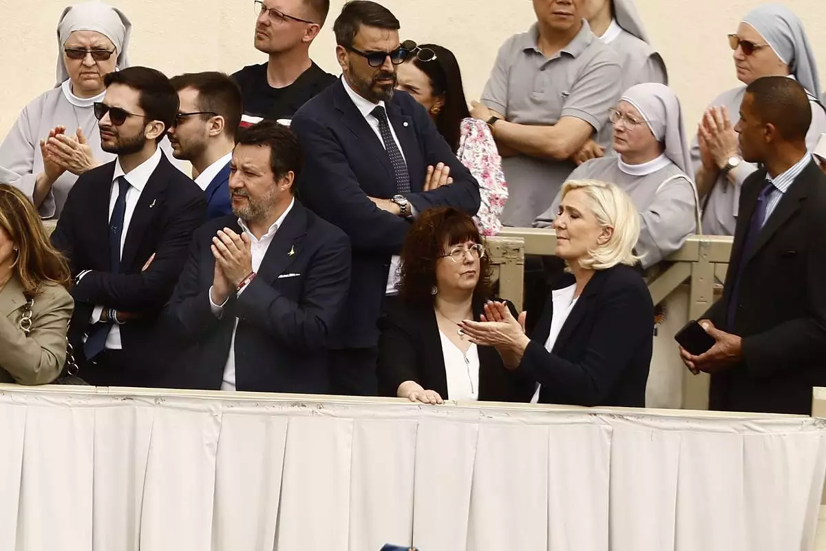 Italian Deputy Prime Minister Matteo Salvini, center, left, and French far-right leader Marine Le Pen, center right, are seen in the crowd as they attend Pope Leo XIV's appearance at the central balcony of St. Peter's Basilica for his first Sunday blessing after his election, in St. Peter's Square at the Vatican, Sunday, May 11, 2025. (Cecilia Fabiano/LaPresse via AP)