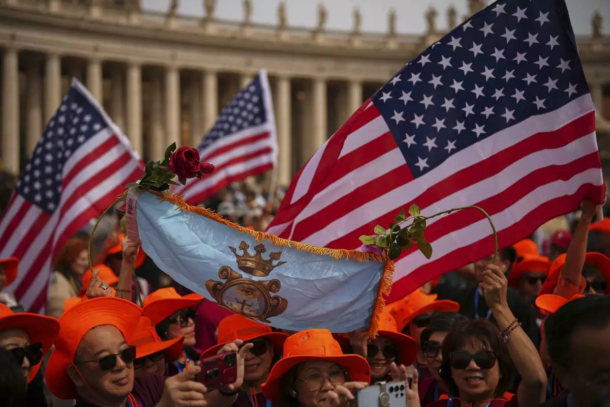 Faithful wave flags from the United States as they wait for Pope Leo XIV to appear at the central balcony of St. Peter's Basilica for his first Sunday blessing after his election, in St. Peter's Square at the Vatican, Sunday, May 11, 2025.(AP Photo/Andrew Medichini)