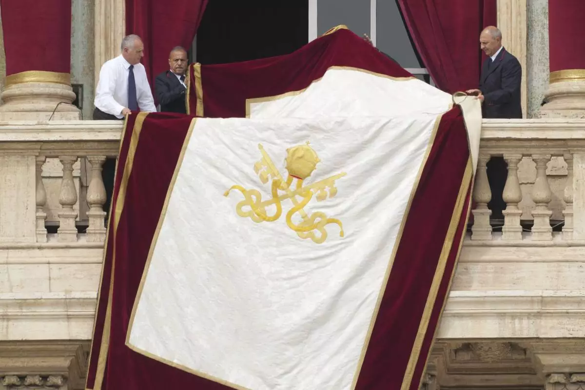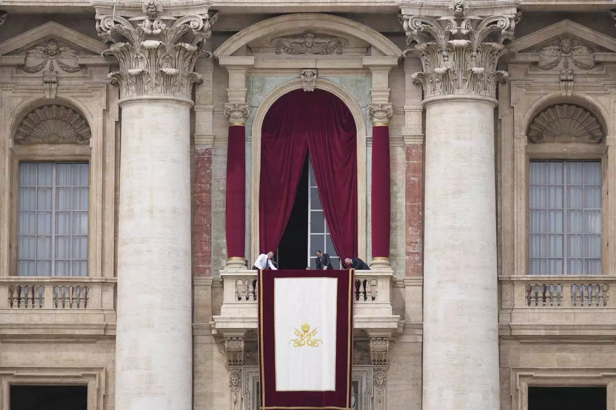 Vatican clerks prepare the loggia ahead of Pope Leo XIV's appearance at the central balcony of St. Peter's Basilica for his first Sunday blessing after his election, in St. Peter's Square at the Vatican, Sunday, May 11, 2025.(AP Photo/Andrew Medichini)