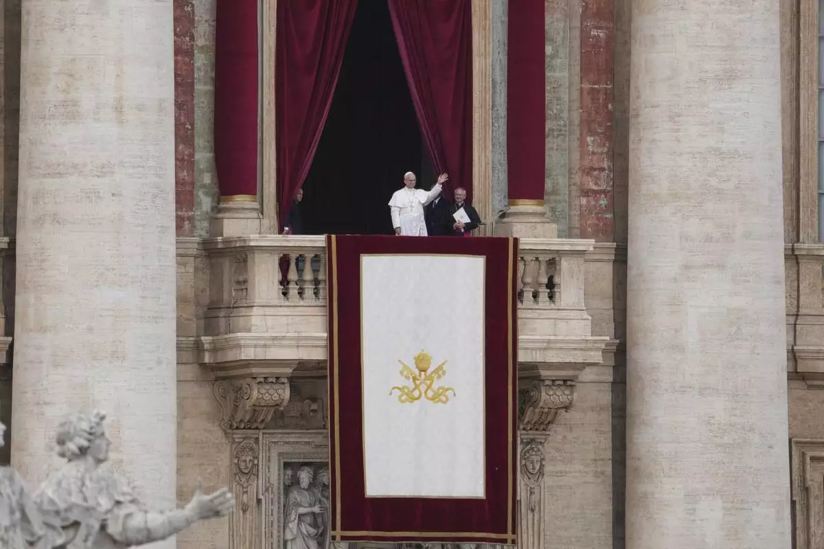 Pope Leo XIV waives from the central balcony of St. Peter's Basilica overlooking St. Peter's Square where tens of thousands of faithful gathered at noon to receive the first traditional Sunday blessing after his election on Thursday and to pray the Regina Caeli, Sunday, May 11, 2025. (Vatican Media via AP)