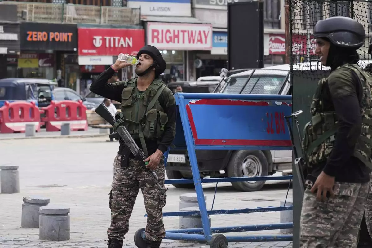 An Indian soldier drinks water as he guards after India and Pakistan reported no incidents of firing overnight, in Srinagar, Indian controlled Kashmir Monday, May 12, 2025. (AP Photo/Mukhtar Khan)