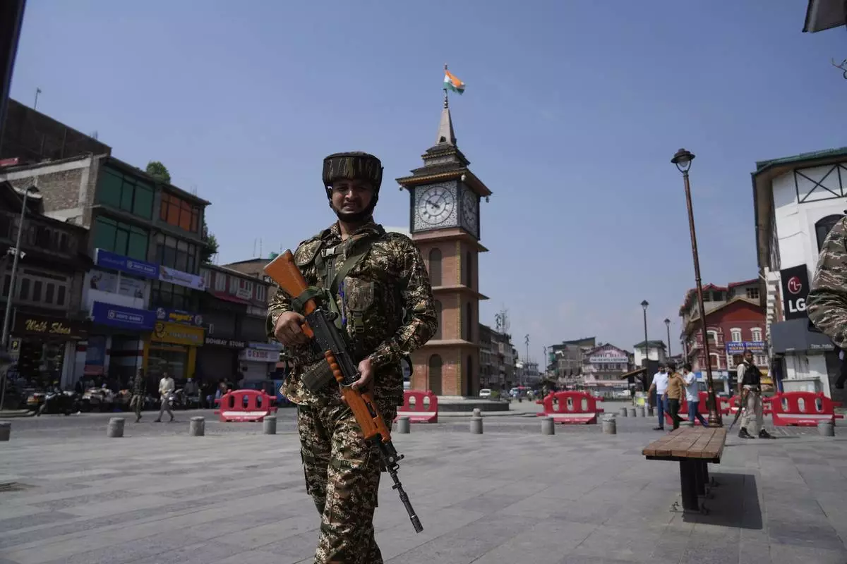 An Indian soldier patrols as he guard near a clock tower day after the ceasefire between Indian and Pakistan in Srinagar, in Indian controlled Kashmir, Sunday, May 11, 2025.(AP Photo/Mukhtar Khan)