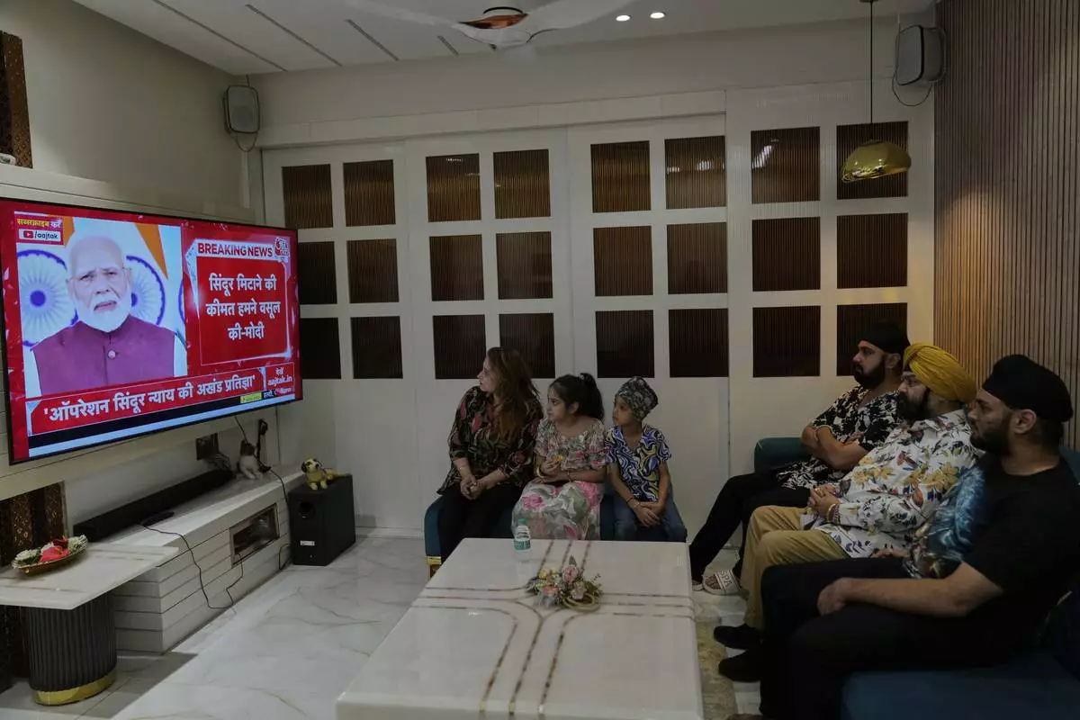 Family members watch the live telecast of Indian Prime Minister Narendra Modi's speech on a television at their residence in Hyderabad, India, Monday, May 12, 2025. (AP Photo/Mahesh Kumar A.)