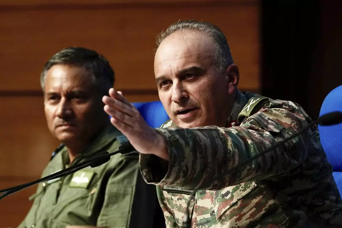 Director General of Military Operations Lt. Gen. Rajiv Ghai, right, speaks to the media at a press conference as Air Marshal AK Bharti looks on, in New Delhi, Sunday, May 11, 2025. (AP Photo/Manish Swarup)