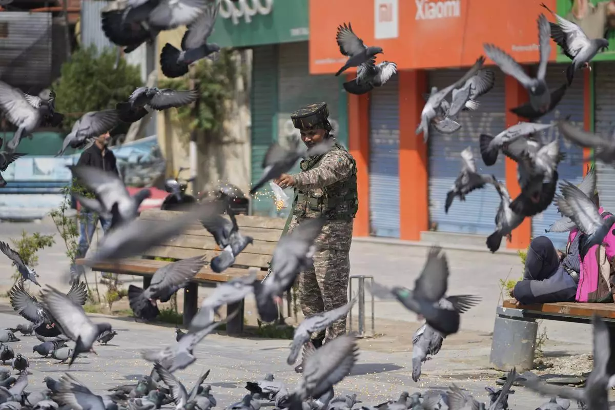 An Indian soldier feeds pigeons at a market, day after India and Pakistan agreed to a ceasefire Saturday following U.S.-led talks to end the most serious military confrontation between the nuclear-armed rivals in decades, in Srinagar, in Indian controlled Kashmir, Sunday, May 11, 2025.(AP Photo/Mukhtar Khan)