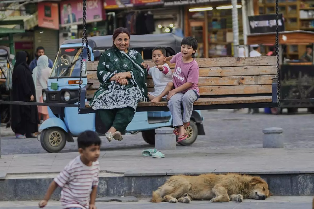A Kashmiri woman along with her children sits on a swing after ceasefire between India and Pakistan was announced in Srinagar, in Indian controlled Kashmir, Saturday, May 10, 2025.(AP Photo/Mukhtar Khan)