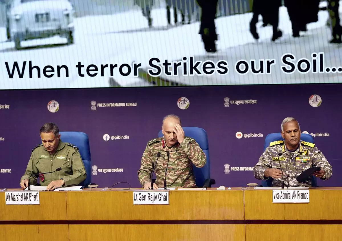 Left to right; Air Marshal AK Bharti, Director General of Military Operations Lt. Gen. Rajiv Ghai, Vice Admiral AN Pramod address a press conference in New Delhi, Sunday, May 11, 2025. (AP Photo/Manish Swarup)