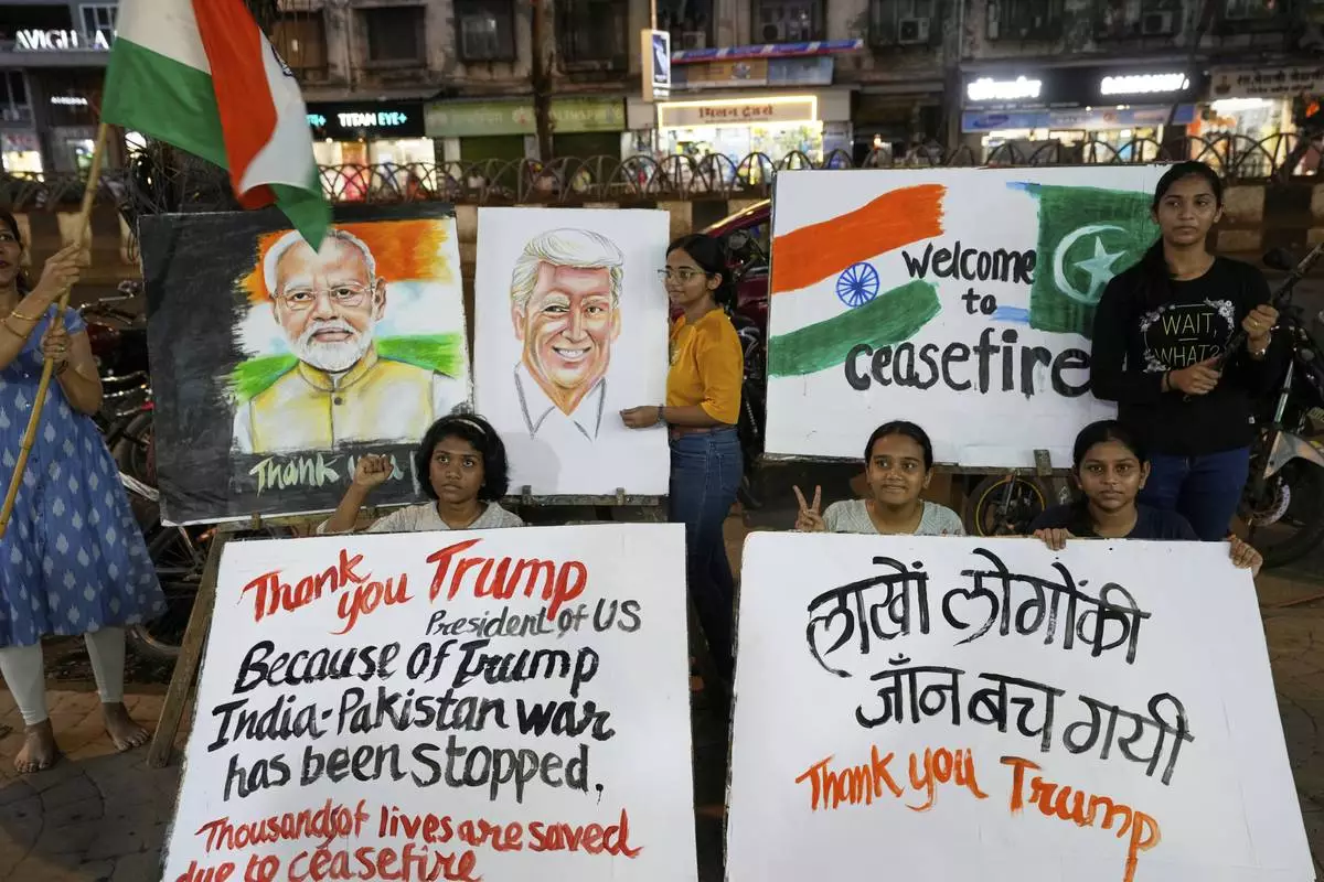 Students of an art school and their teacher carry a hand-drawn portrait of the US President Donald Trump as they celebrate the ceasefire between India and Pakistan, in Mumbai, India, Saturday, May 10, 2025. (AP Photo/Rajanish Kakade)