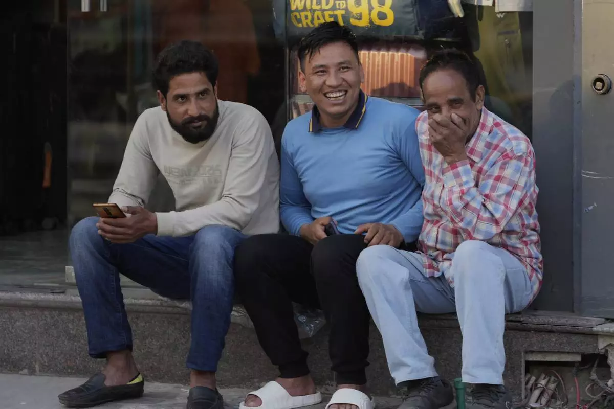 Kashmiri men gesturesas they sit outside the shop after a ceasefire between India and Pakistan was announced in Srinagar, in Indian controlled Kashmir, Saturday, May 10, 2025.(AP Photo/Mukhtar Khan)