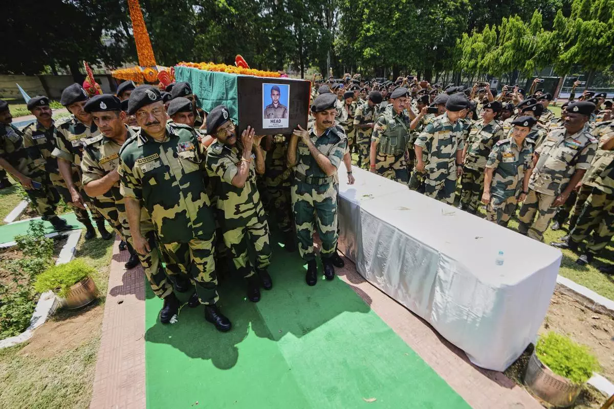 Indian Border Security Force (BSF) Soldiers carry a coffin containing the remains of a fellow soldier Deepak Chimngakham, who was killed in cross border Pakistani artillery shelling, in Jammu, India, Monday, May 12, 2025.(AP Photo/Channi Anand)