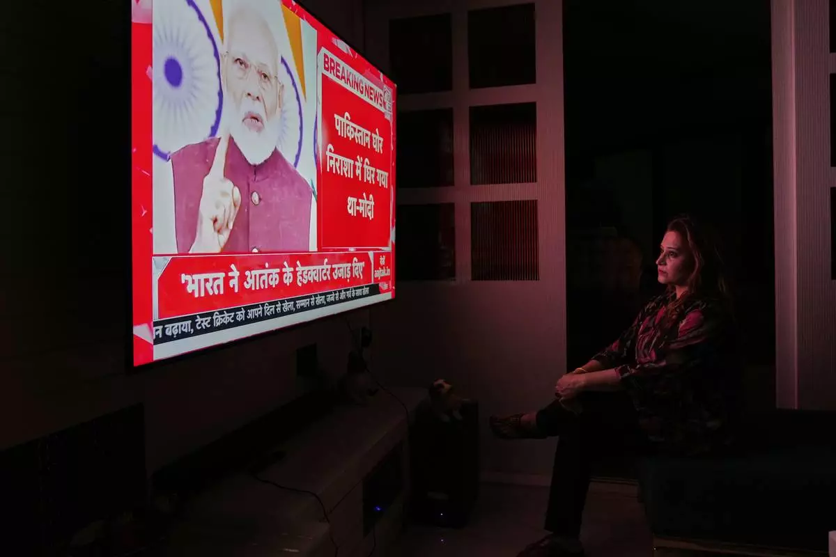 A woman watches the live telecast of Indian Prime Minister Narendra Modi's speech on television at a their residence in Hyderabad, India, Monday, May 12, 2025. (AP Photo/Mahesh Kumar A.)