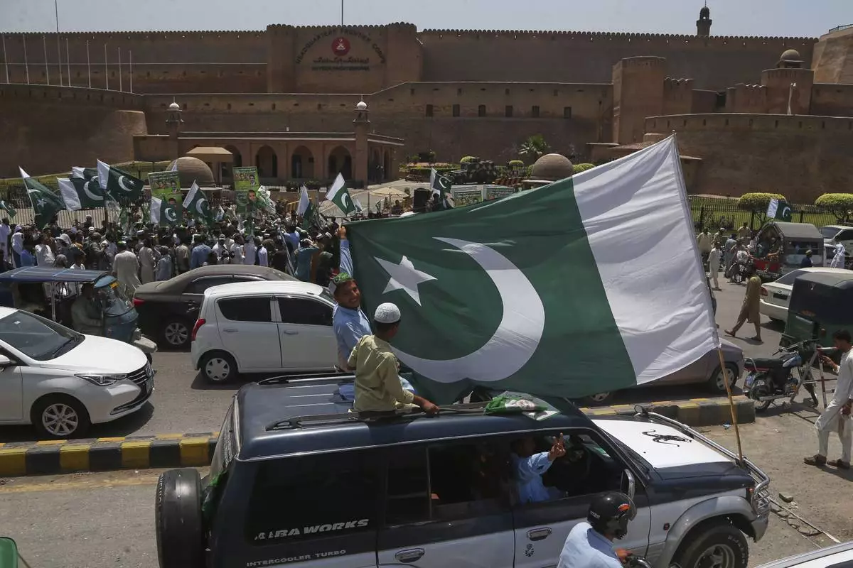 People with national flags take part in a demonstration to show their support with Pakistan Army, a day after the ceasefire between Indian and Pakistan was announced, in Peshawar, Pakistan, Sunday, May 11, 2025. (AP Photo/Muhammad Sajjad)