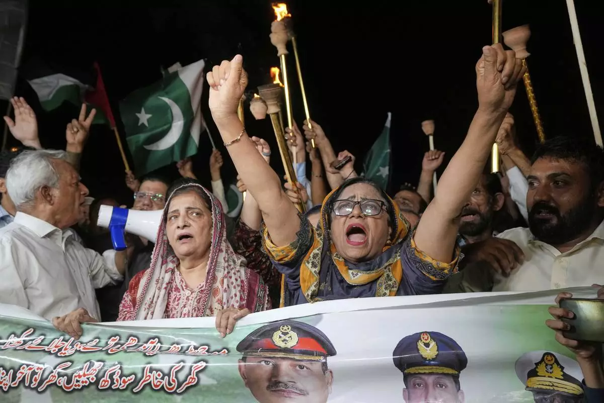 People chant slogans as they celebrate following India and Pakistan have reached a ceasefire deal, during a demonstration, in Multan, Pakistan, Saturday, May 10, 2025. (AP Photo/Asim Tanveer)