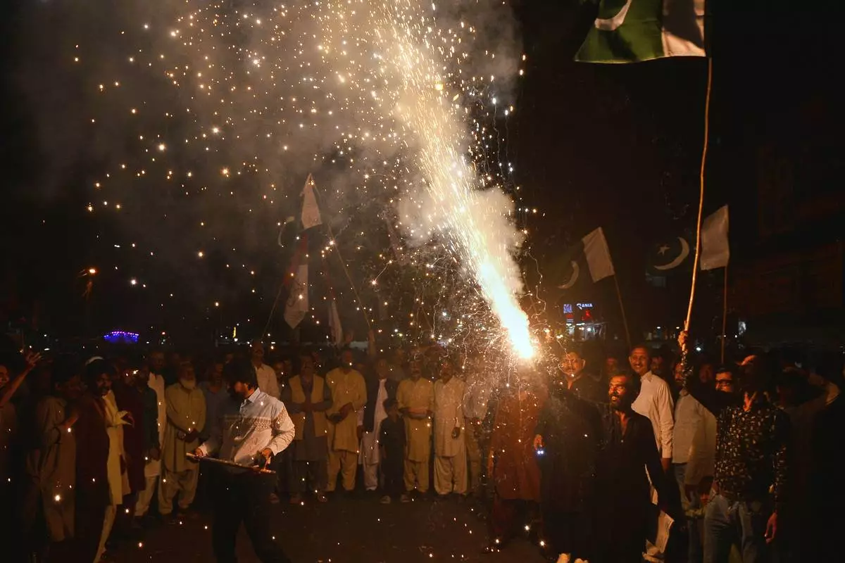 People light fireworks to celebrate Pakistan and India reaching a ceasefire deal, during a demonstration in Hyderabad, Pakistan, Saturday, May 10, 2025. (AP Photo/Pervez Masih)
