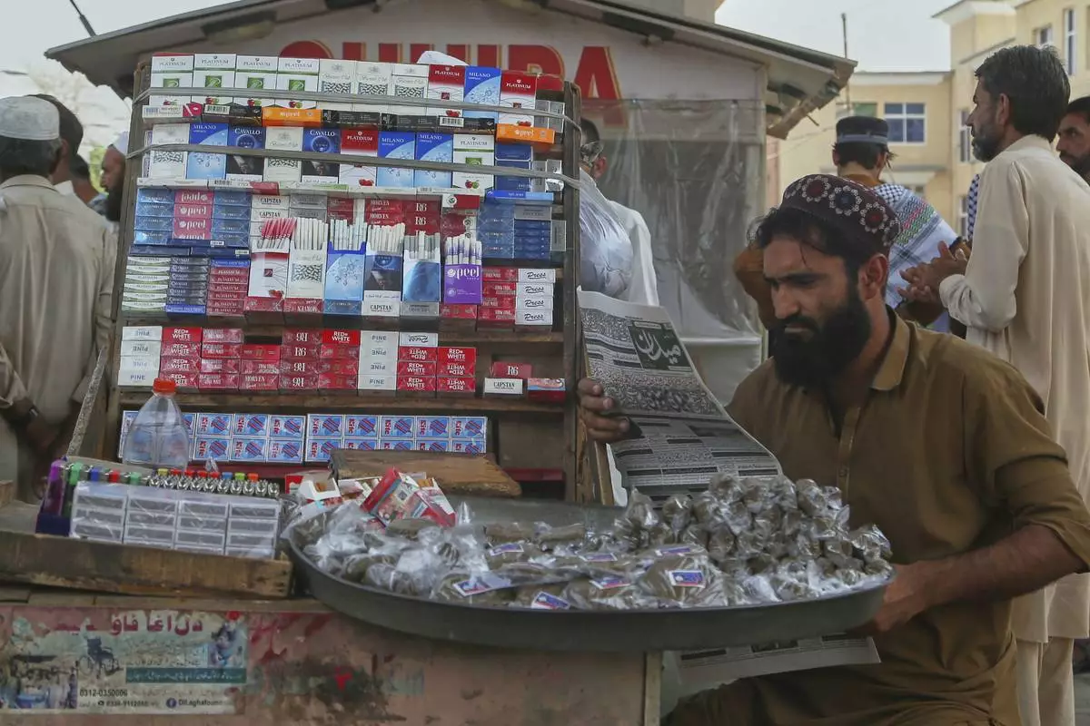 A street hawker reads a morning newspaper at a stall, a day after the ceasefire between Indian and Pakistan was announced, in Peshawar, Pakistan, Sunday, May 11, 2025. (AP Photo/Muhammad Sajjad)