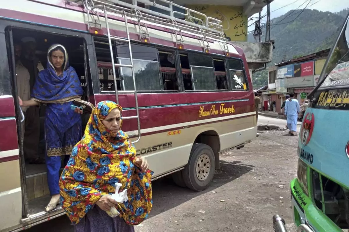 Local residents depart a passenger bus upon their arrival at a bus terminal, day after the ceasefire between Indian and Pakistan was announced, in Chakothi, near Line of Control, some 61 kilometres (38 miles) from Muzaffarabad, the capital of Pakistan controlled Kashmir, Sunday, May 11, 2025. (AP Photo/Roshan Mughal)