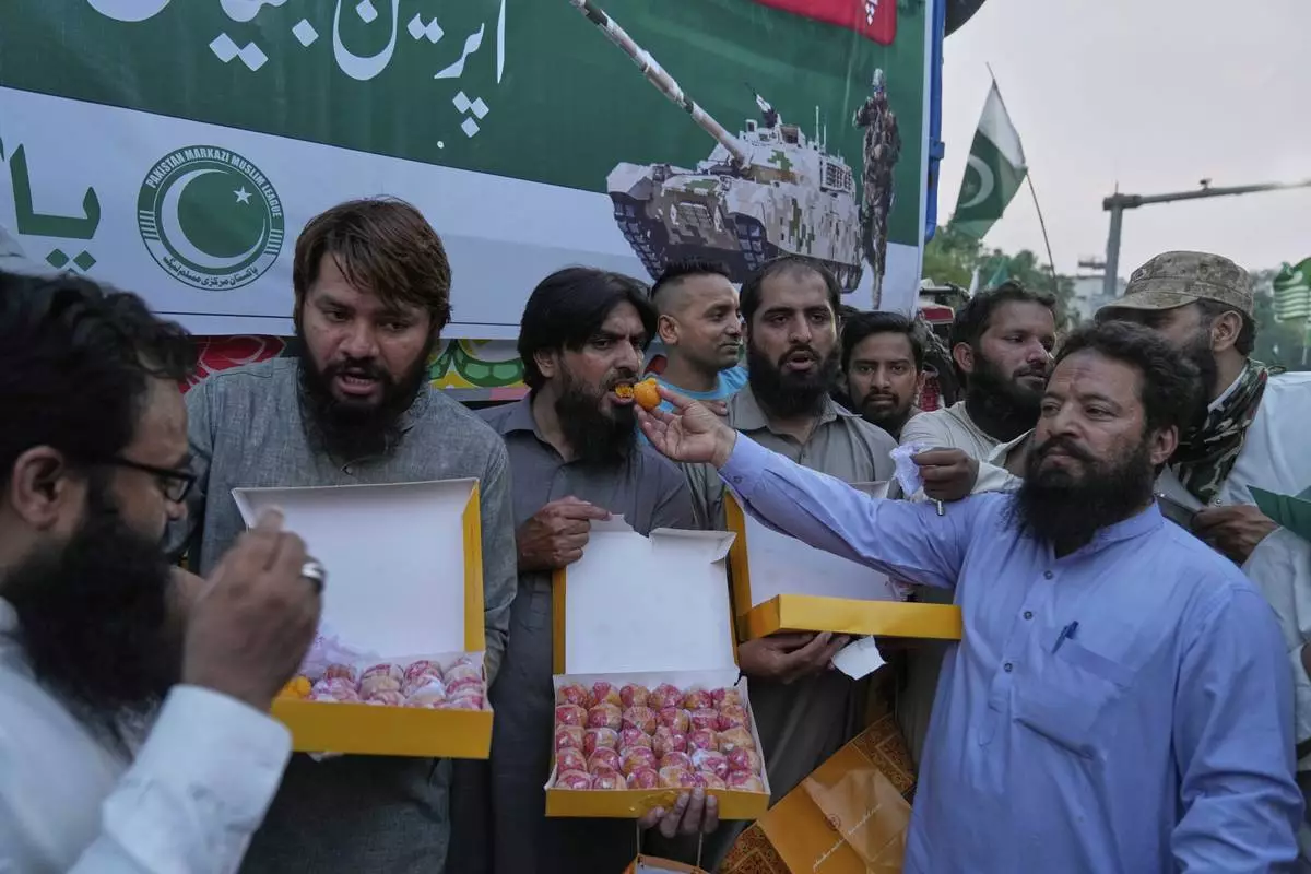 People share sweets as they celebrate following India and Pakistan have reached a ceasefire deal, during a demonstration, in Lahore, Pakistan, Saturday, May 10, 2025. (AP Photo/K.M. Chaudary)
