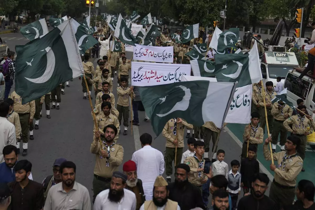 People with national flags take part in a rally to show solidarity with Pakistan Army, a day after the ceasefire between Indian and Pakistan was announced, in Lahore, Pakistan, Sunday, May 11, 2025. (AP Photo/K.M. Chaudary)