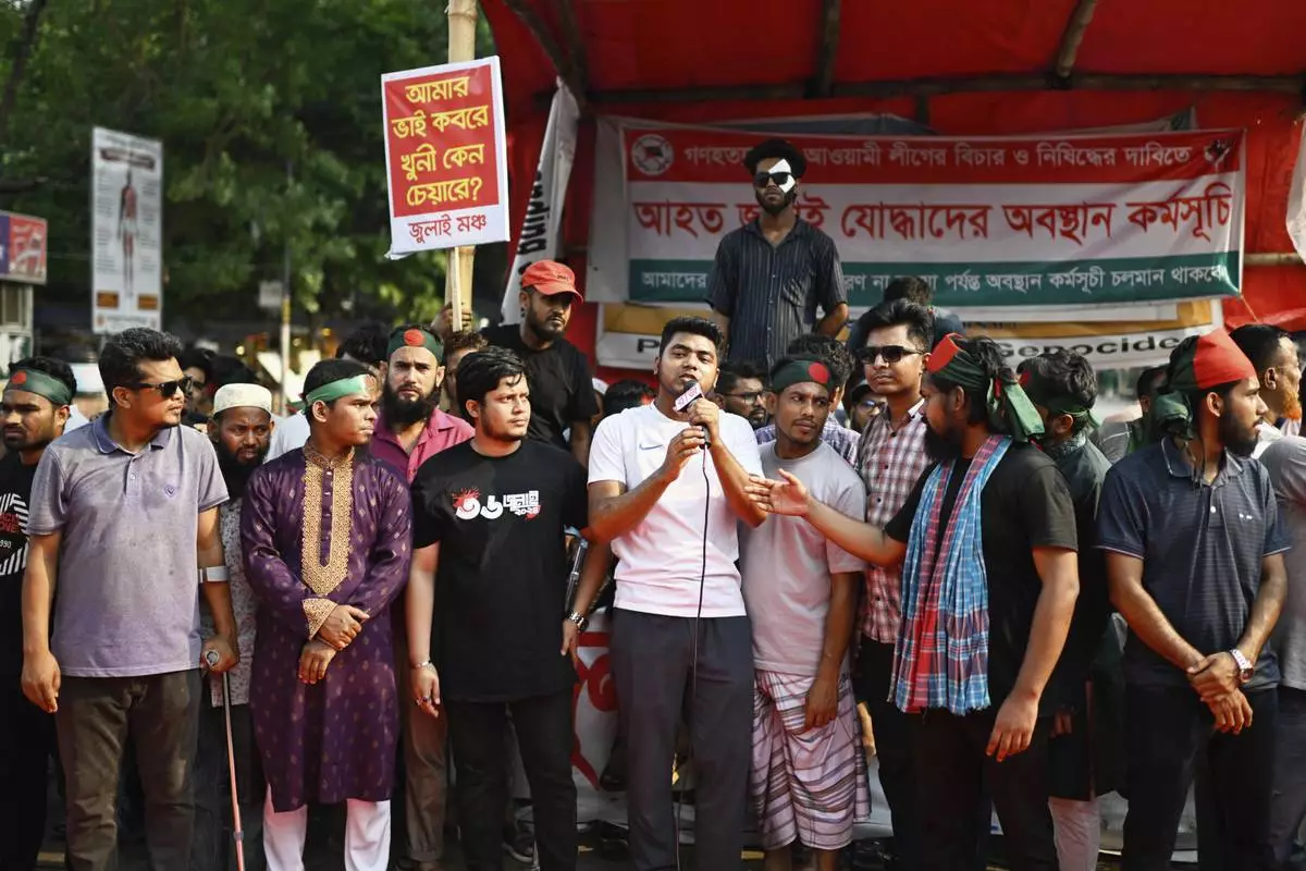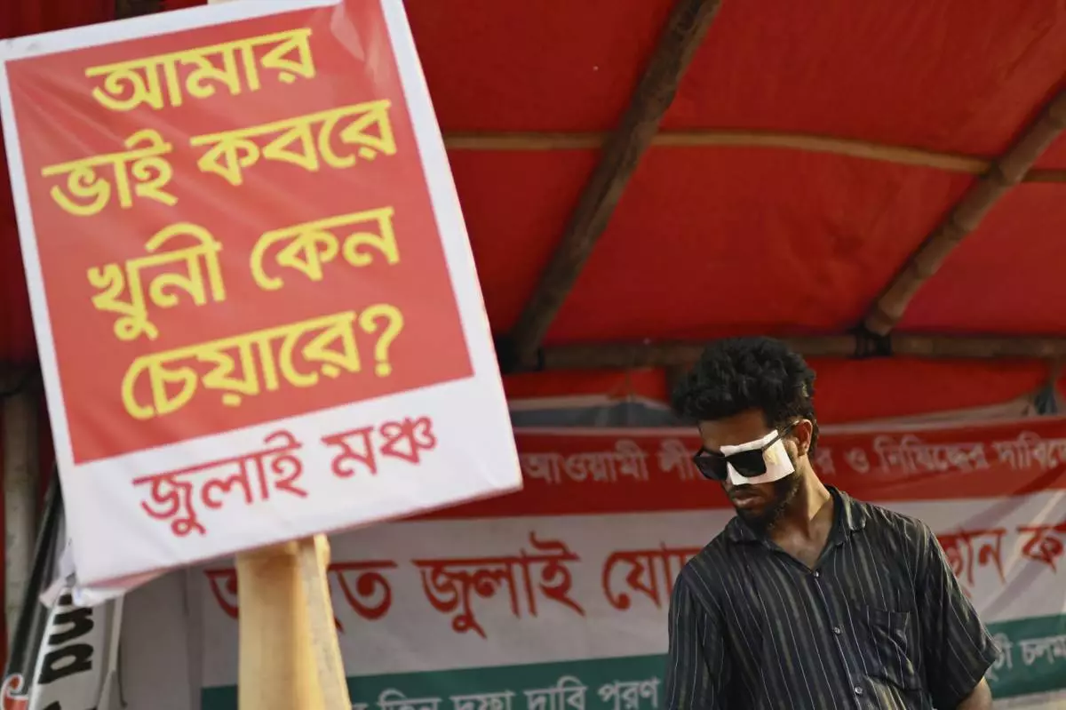 A man who was injured in protests against former Prime Minister Sheikh Hasina last year, stands next to a banner that reads 'My brother is in the grave, why is the murderer in the chair?' during a protest to demand a ban on her Awami League party, in Dhaka, Bangladesh, Sunday, May 11, 2025. (AP Photo/Mahmud Hossain Opu)