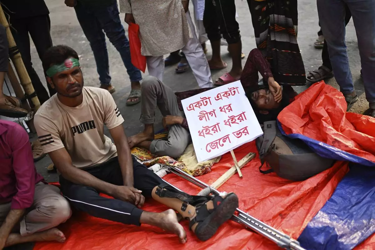 Protesters, who were injured in protests against former Prime Minister Sheikh Hasina last year, sit with a banner that reads 'One by one Awami League supporters should be detained and taken into custody' during a protest, in Dhaka, Bangladesh, Sunday, May 11, 2025. (AP Photo/Mahmud Hossain Opu)