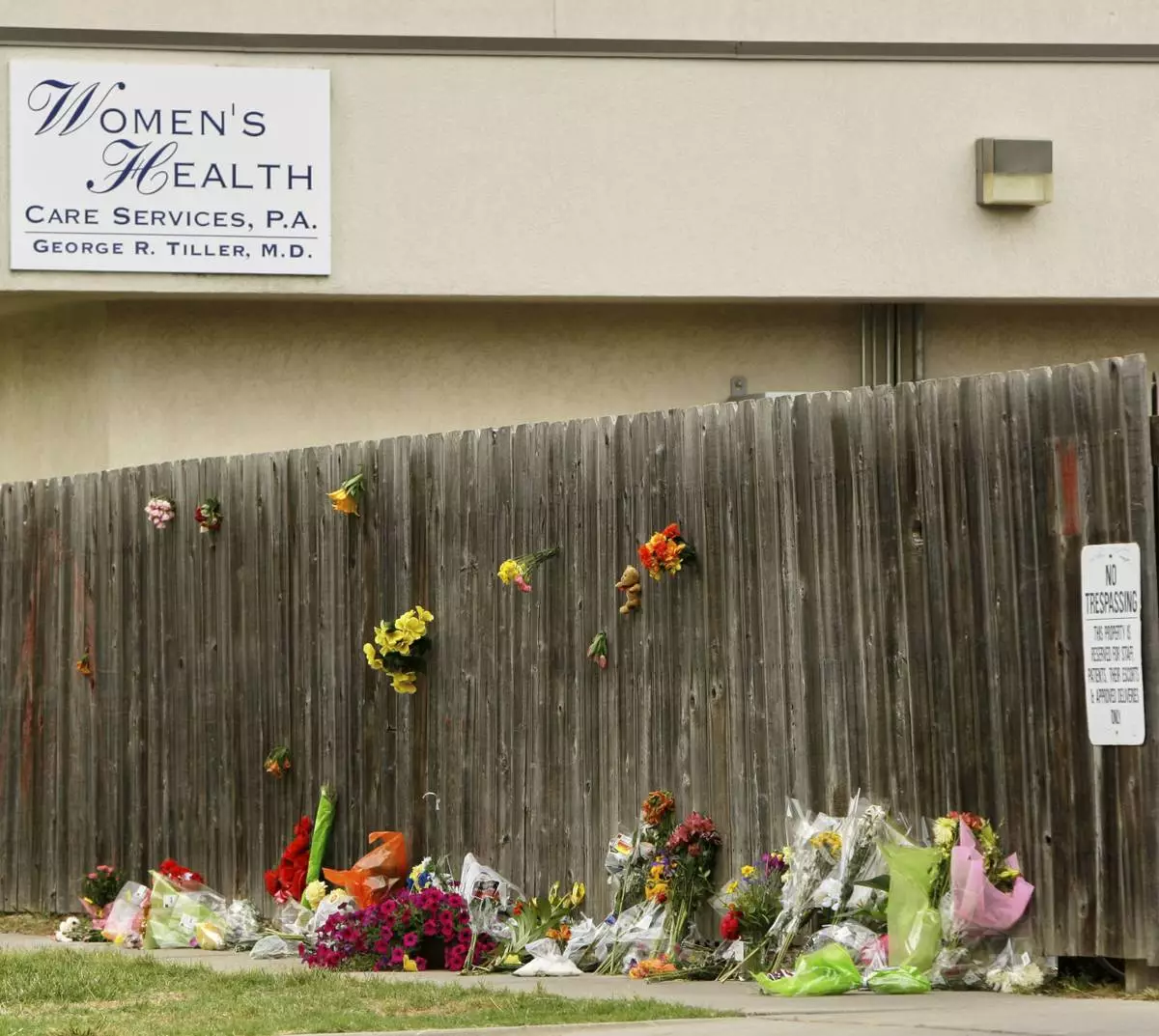FILE - Mementos are placed at a memorial outside Women's Health Care Services owned by Dr. George Tiller in Wichita, Kan., Tuesday, June 2, 2009, after he was fatally shot during church services Sunday. (AP Photo/Charlie Riedel, File)