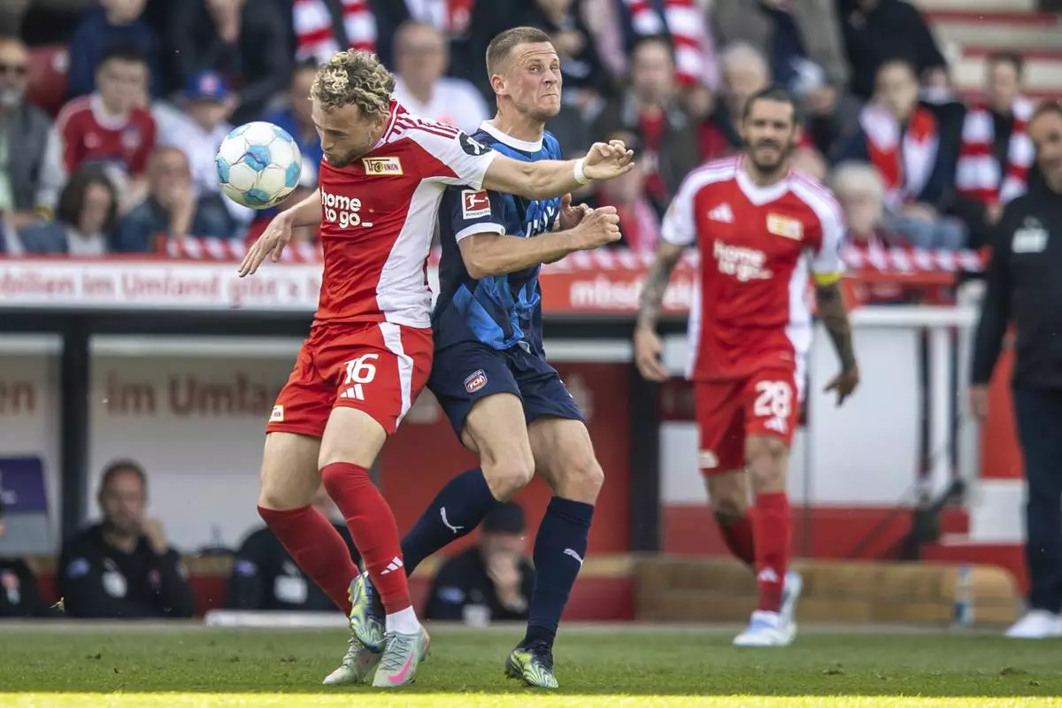 Heidenheim's Adrian Beck, right, and Berlin's Benedict Hollerbach, left, challenge for the ball during the German Bundesliga soccer match between 1. FC Union Berlin and FC Heidenheim in Berlin, Germany, Saturday, May 10, 2025. (Andreas Gora/dpa via AP)