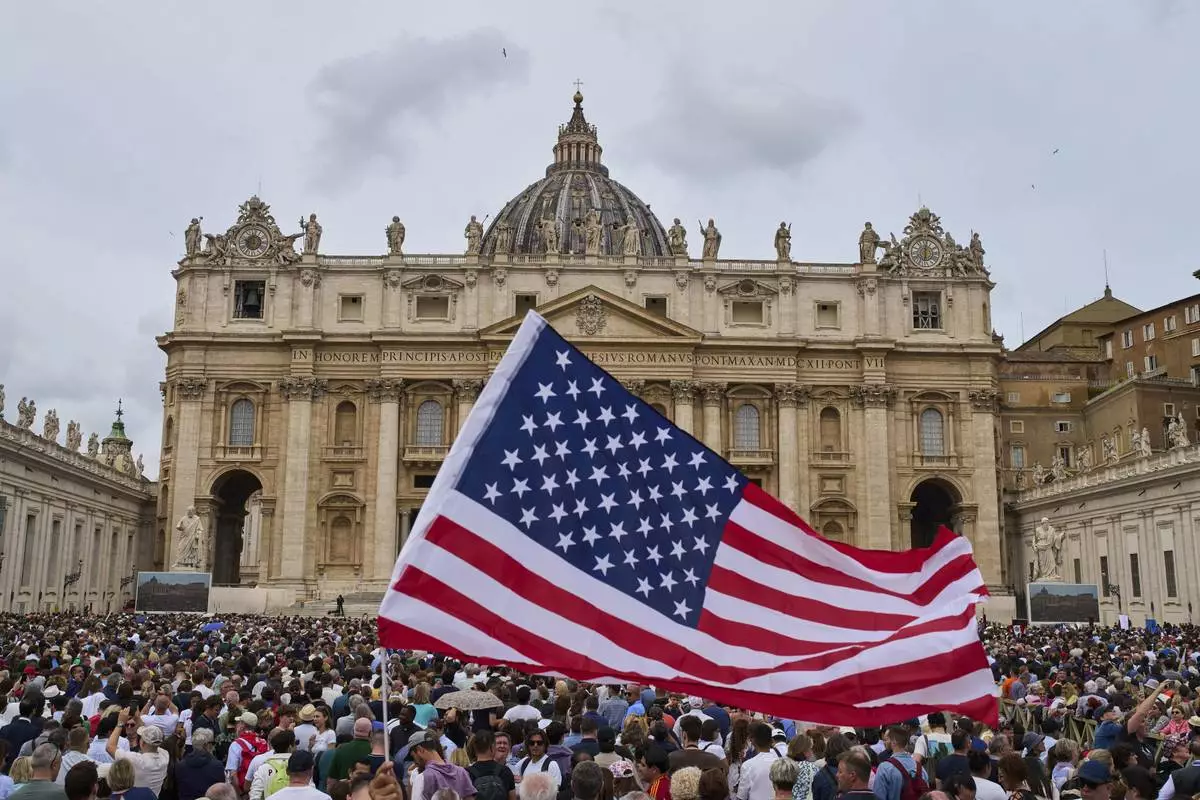 Faithful wave flags from the United States as they wait for Pope Leo XIV to appear at the central balcony of St. Peter's Basilica for his first Sunday blessing after his election, in St. Peter's Square at the Vatican, Sunday, May 11, 2025.(AP Photo/Andrew Medichini)