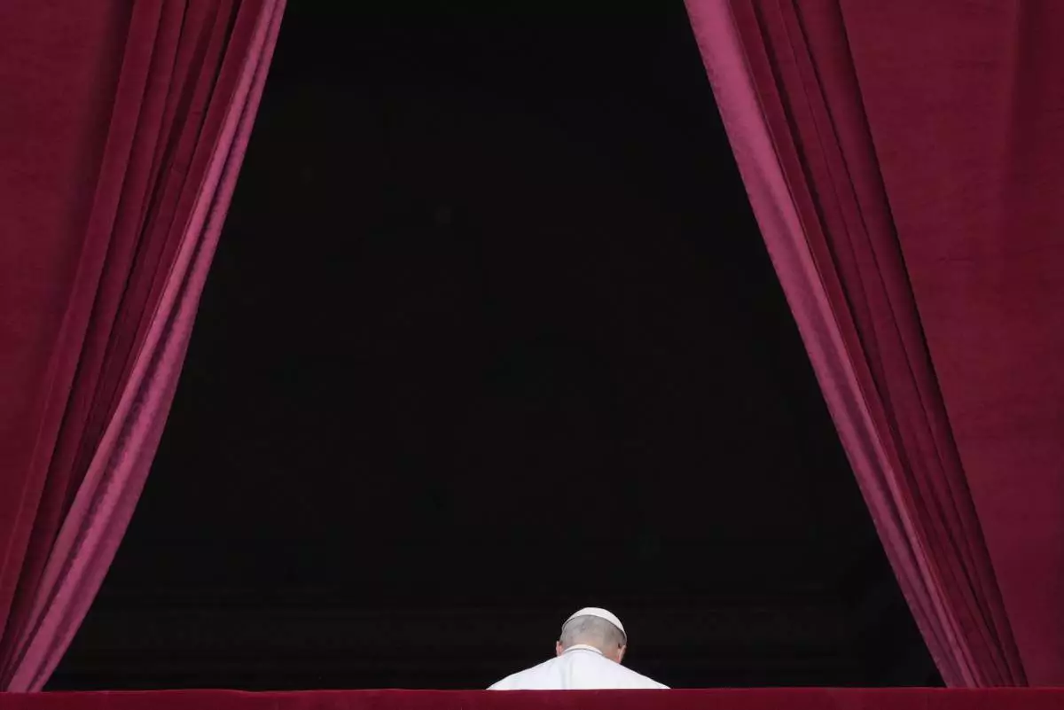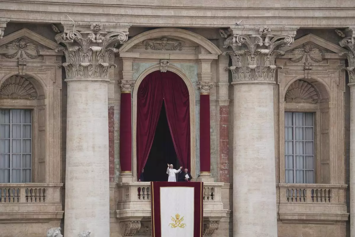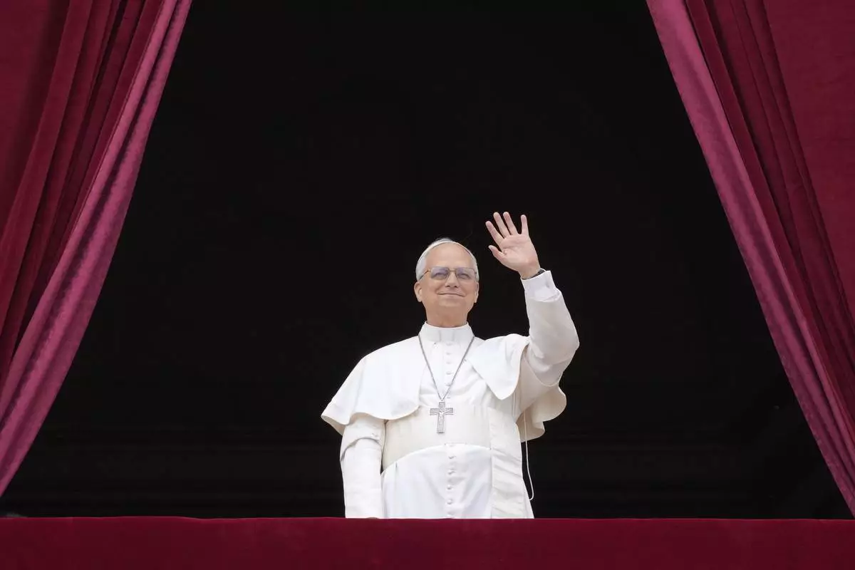 Pope Leo XIV leaves after delivering his message from the central balcony of St. Peter's Basilica for his first Sunday blessing after his election, in St. Peter's Square at the Vatican, Sunday, May 11, 2025.(AP Photo/Gregorio Borgia)