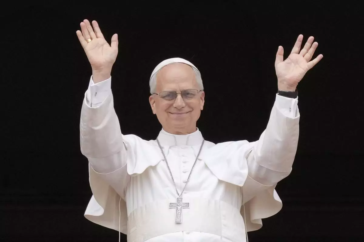 Pope Leo XIV appears at the central balcony of St. Peter's Basilica for his first Sunday blessing after his election, in St. Peter's Square at the Vatican, Sunday, May 11, 2025.(AP Photo/Andrew Medichini)