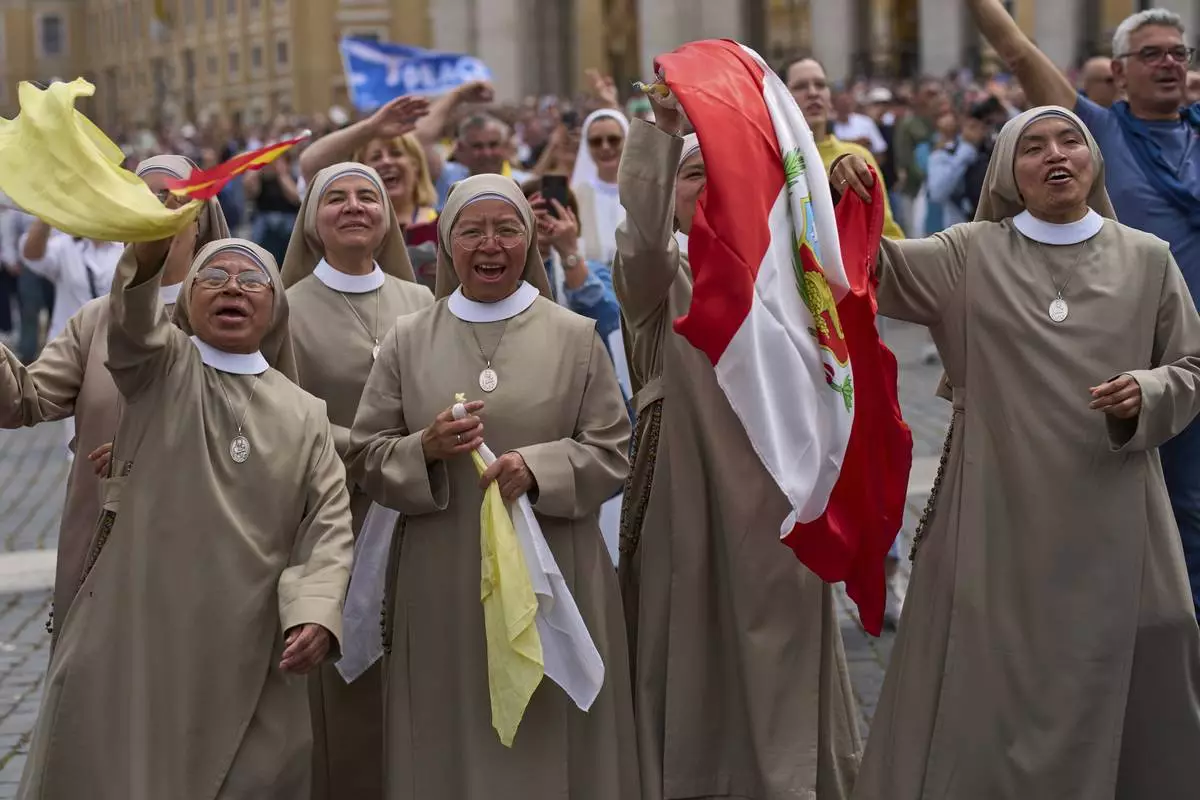 Nuns cheer during Pope Leo XIV's appearance from the central balcony of St. Peter's Basilica for his first Sunday blessing after his election, in St. Peter's Square at the Vatican, Sunday, May 11, 2025.(AP Photo/Bernat Armangue)