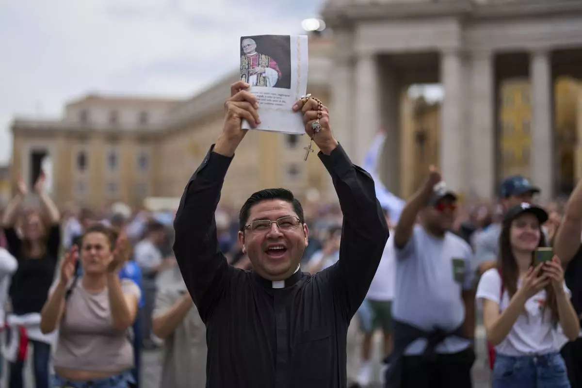 A priest celebrates as Pope Leo XIV appears at the central balcony of St. Peter's Basilica for his first Sunday blessing after his election, in St. Peter's Square at the Vatican, Sunday, May 11, 2025.(AP Photo/Bernat Armangue)