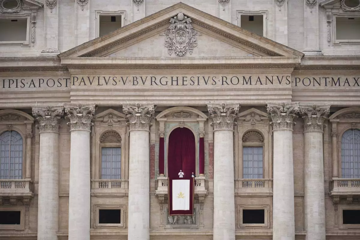 Pope Leo XIV speaks from the central balcony of St. Peter's Basilica from where he delivered his first Sunday blessing since his election to the faithful gathered in St. Peter's Square for the traditional Regina Caeli prayer at noon, on Sunday, May 11, 2025. (AP Photo/Domenico Stinellis)