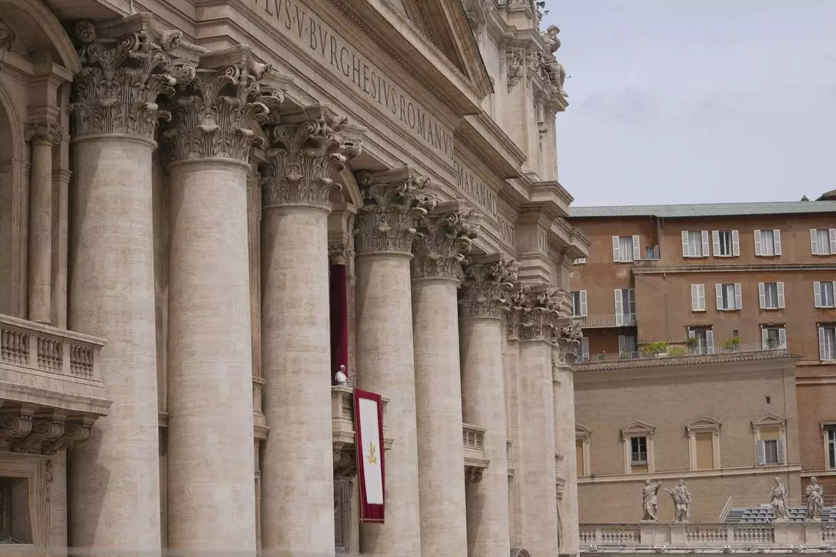 Pope Leo XIV appears at the central balcony of St. Peter's Basilica for his first Sunday blessing after his election, in St. Peter's Square at the Vatican, Sunday May 11, 2025. (AP Photo/Domenico Stinellis)
