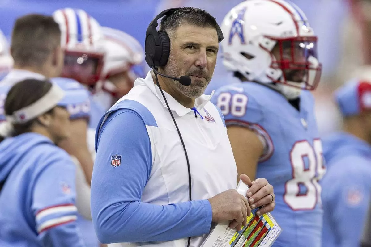 FILE - Tennessee Titans head coach Mike Vrabel looks at the Jumbotron during their NFL football game against the Houston Texans Sunday, Dec. 17, 2023, in Nashville, Tenn. (AP Photo/Wade Payne, File)