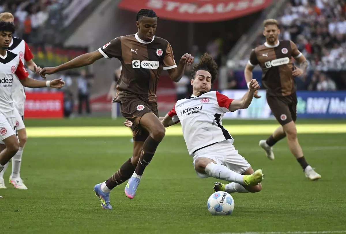 Frankfurt's Arthur Theate, right, and St. Pauli's Morgan Guilavogui, left, challenge for the ball during the German Bundesliga soccer match between Eintracht Frankfurt and FC St. Pauli in Frankfurt, Germany, Sunday, May 11, 2025. (Arne Dedert/dpa via AP)