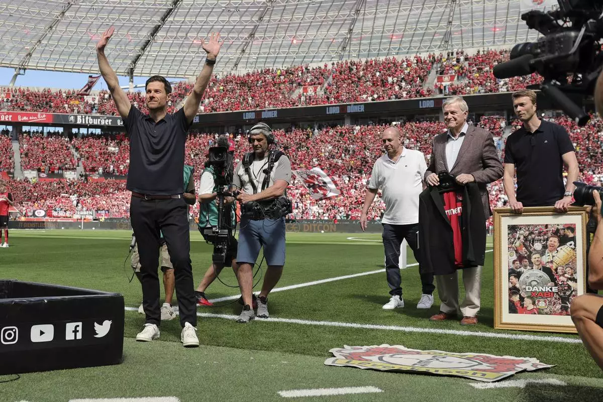 Leverkusen's head coach Xabi Alonso waves to the fans before the German Bundesliga soccer match between Bayer 04 Leverkusen and Borussia Dortmund in Leverkusen, Germany, Sunday, May 11, 2025. (Marius Becker/dpa via AP)