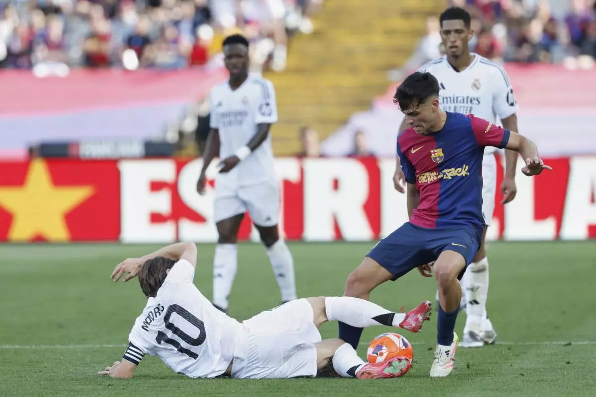 Real Madrid's Luka Modric tackles Barcelona's Pedri during the La Liga soccer match between Barcelona and Real Madrid in Barcelona, Spain, Sunday, May 11, 2025. AP Photo/Joan Monfort)